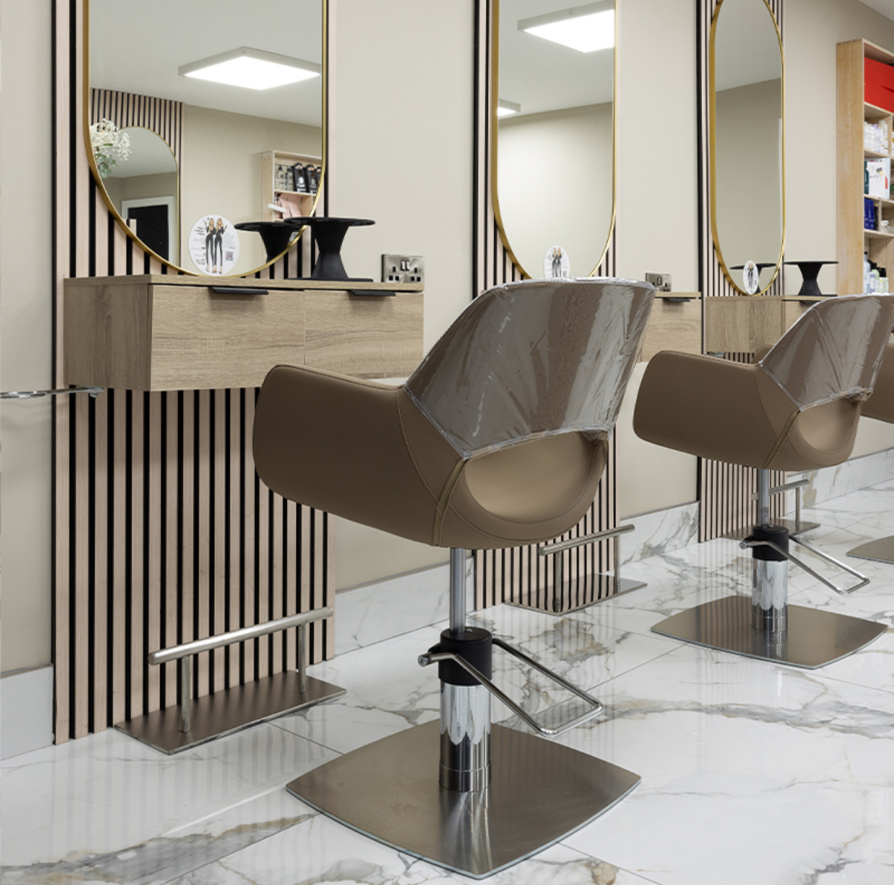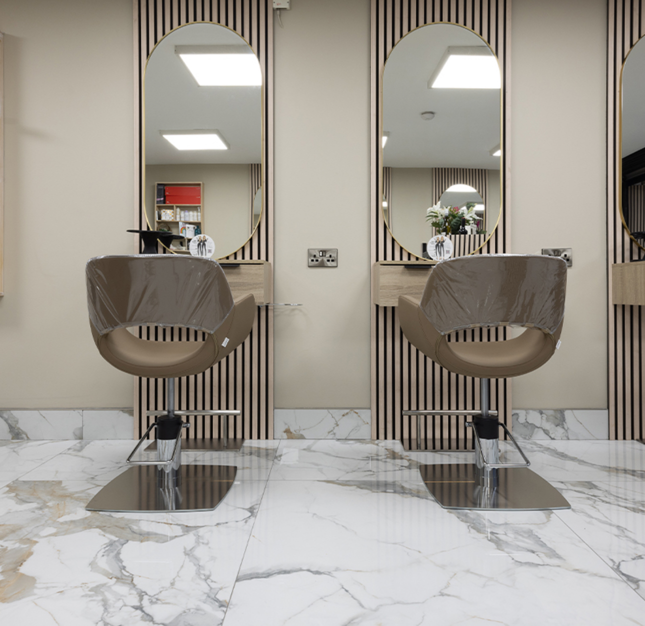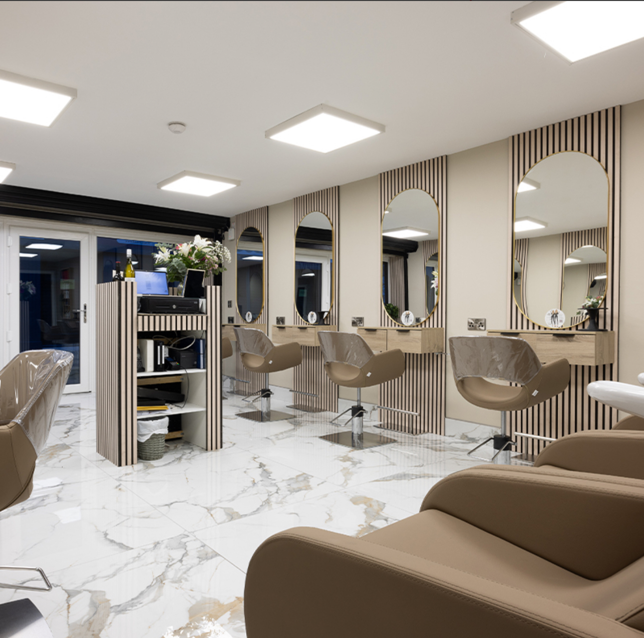 The salon needed a luxury appearance while staying compliant with commercial cleaning standards—requiring careful material selection for floors, walls, and millwork.